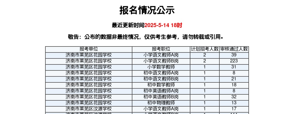 【2025年度济南市莱芜区教育体育系统事业单位公开招聘人员报名情况公示(截至5月13日18:00时)】相关岗位: