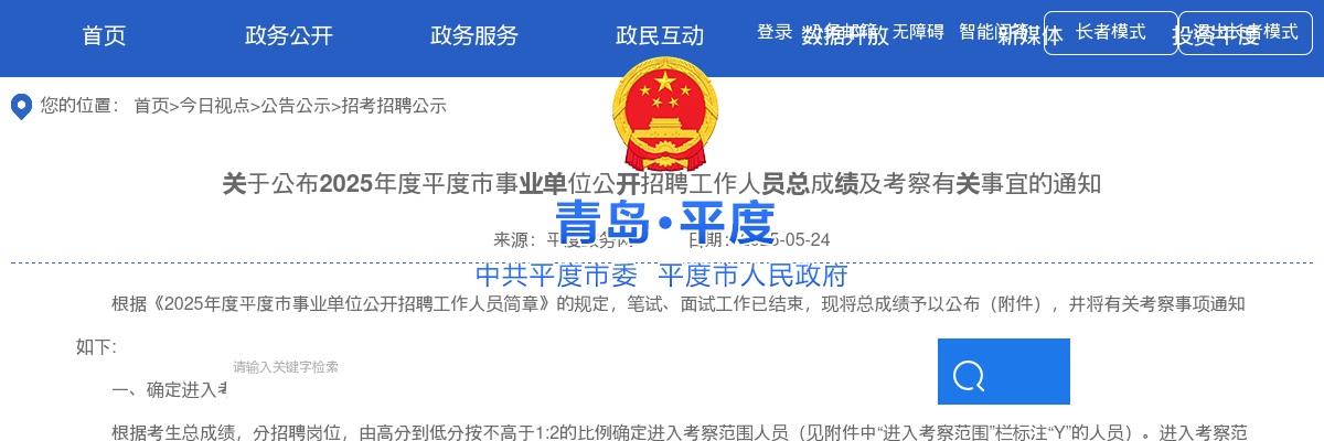 成绩详见:http://www.pingdu.gov.cn/jrsd_15/gggs_15/zkzpgs_15/202505/t20250524_9543661.shtml