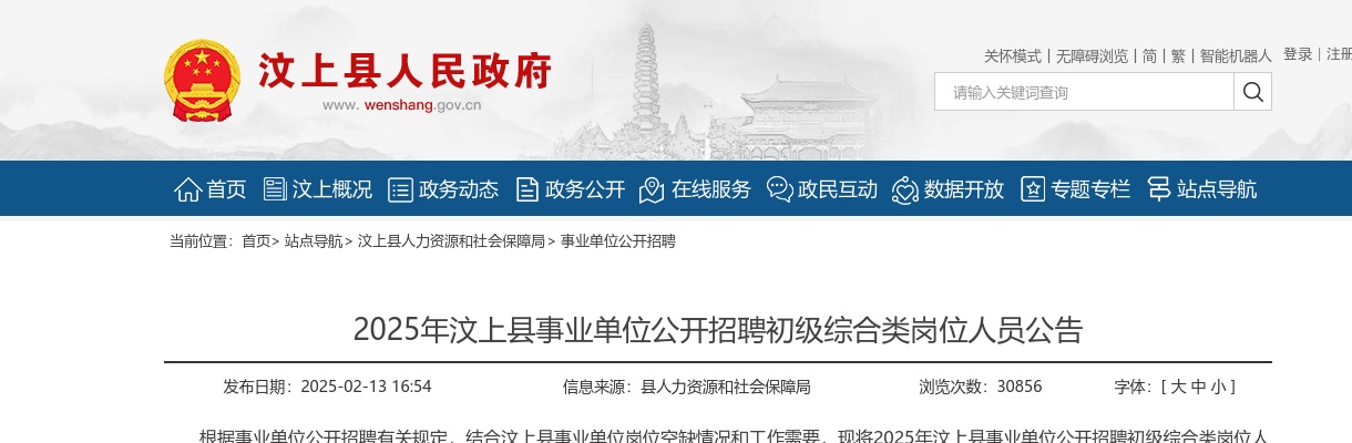 原标题:2025年汶上县事业单位公开招聘初级综合类岗位人员公告