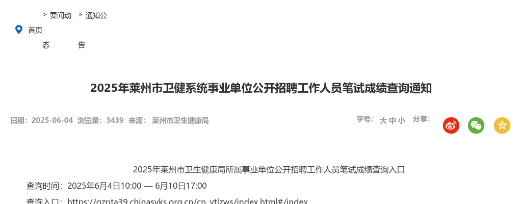 2025年烟台莱州市卫健系统事业单位公开招聘工作人员笔试成绩查询通知